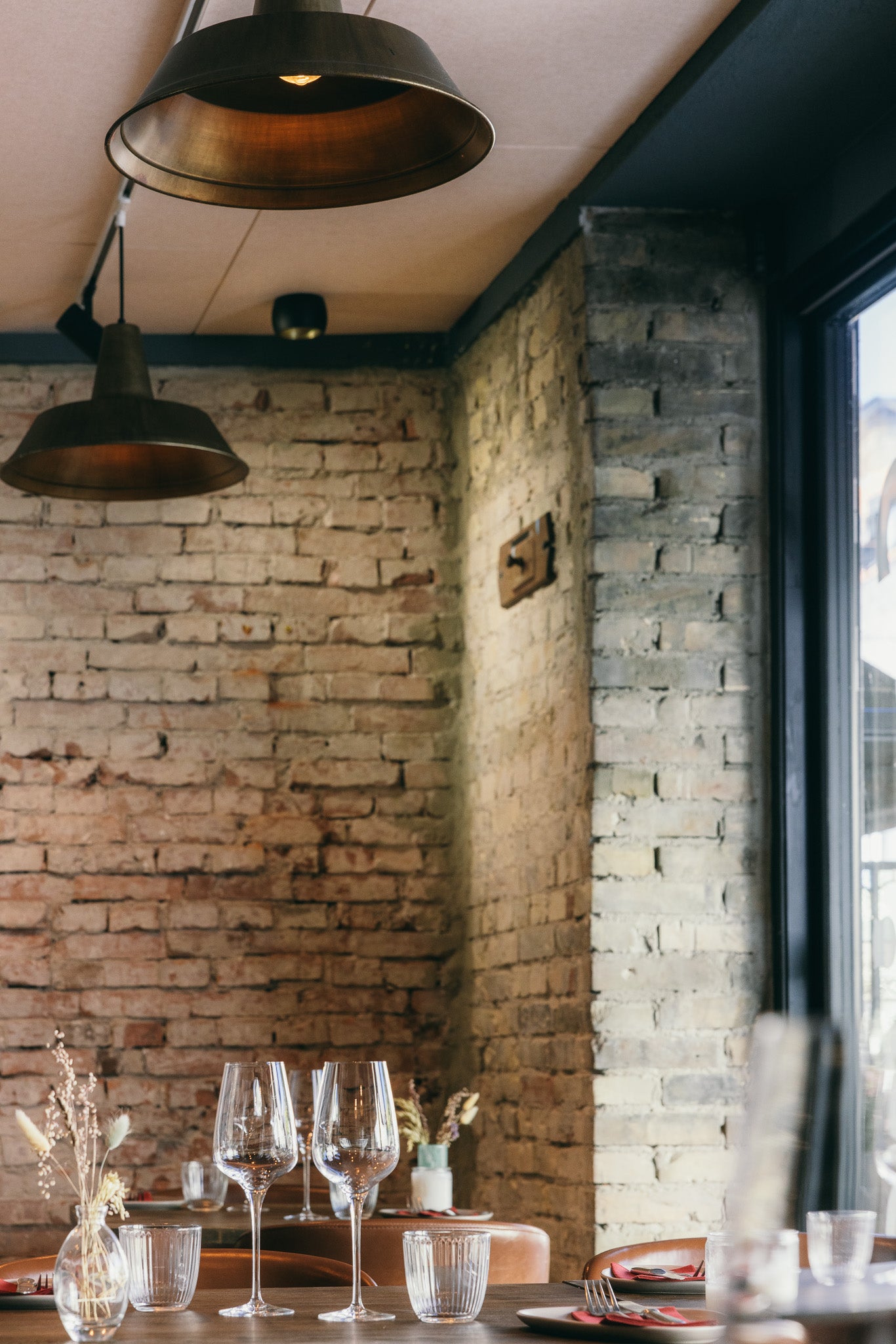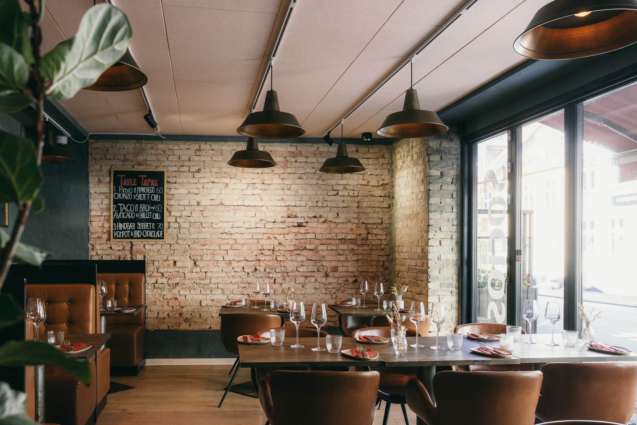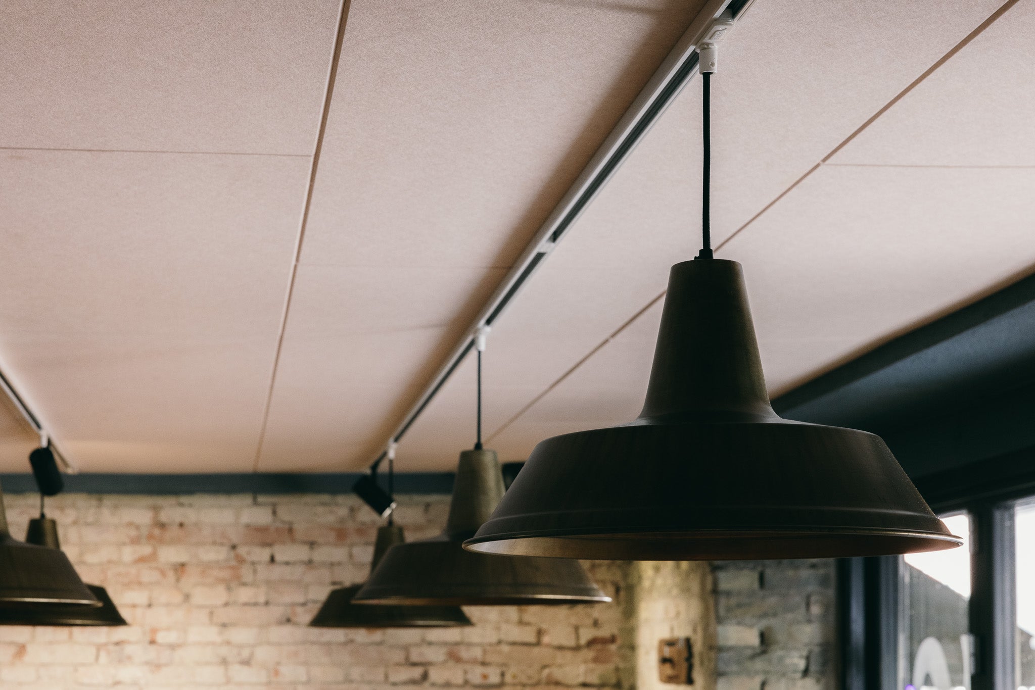 Restauranter er ofte præget af hårde overflader: murstensvægge, glas og træborde. Det giver lang efterklang og en høj lyd, der gør det svært at føre en afslappet samtale. Her ønskede man en løsning, der kunne forbedre akustikken – uden at ændre det rå og hyggelige udtryk.
